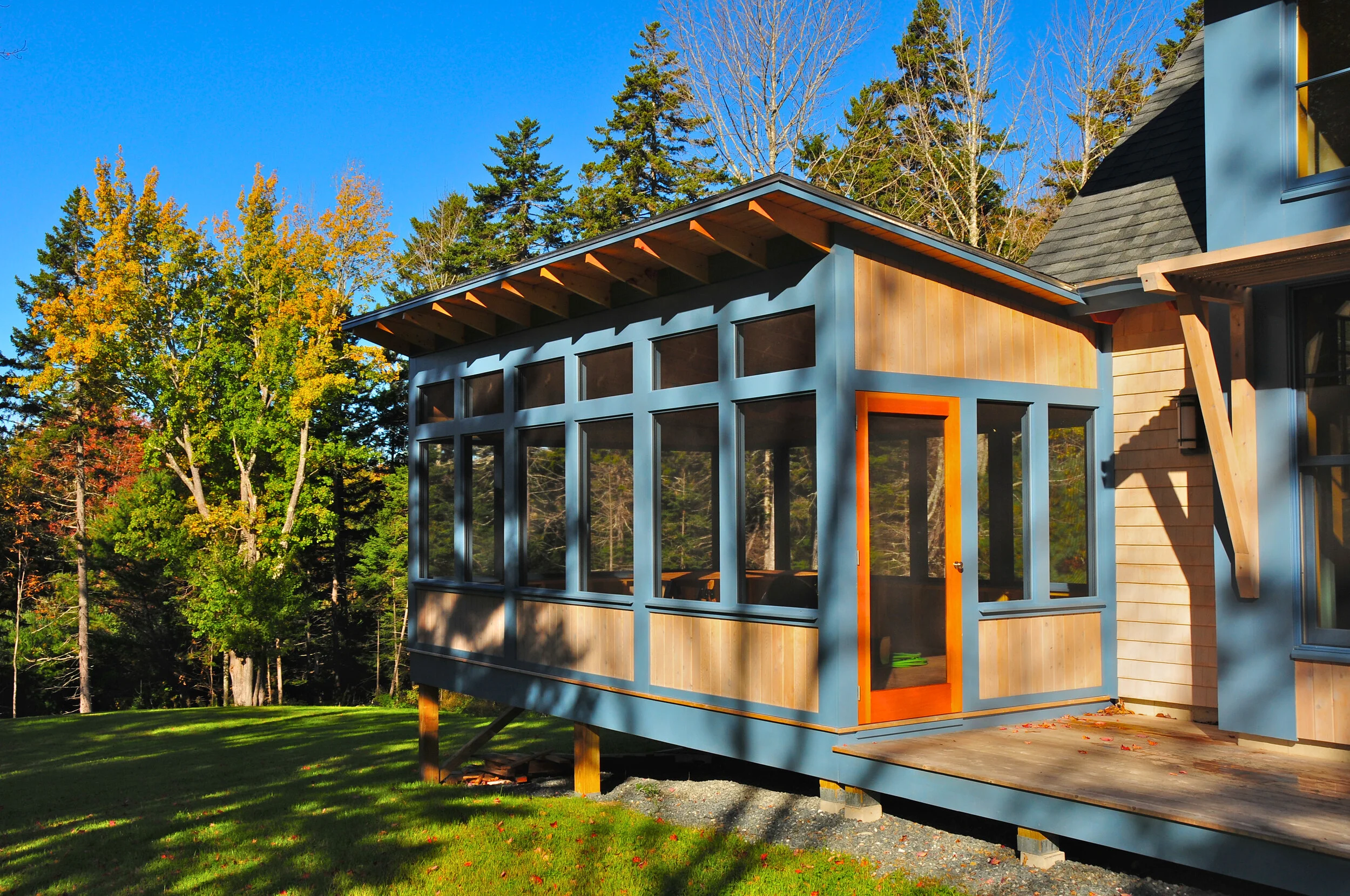 One of the unique project challenges was limited client access. The husband and wife couple were both members of our country’s overseas diplomatic corps. Throughout the nearly three year life of this project, their presence in Maine was limited to about one week per year. As such, face-to-face client/architect design meetings totaled only a few hours - long distance electronic communication was the norm. The first time the clients saw the house in person was after its completion. Fortunately, they loved it!
